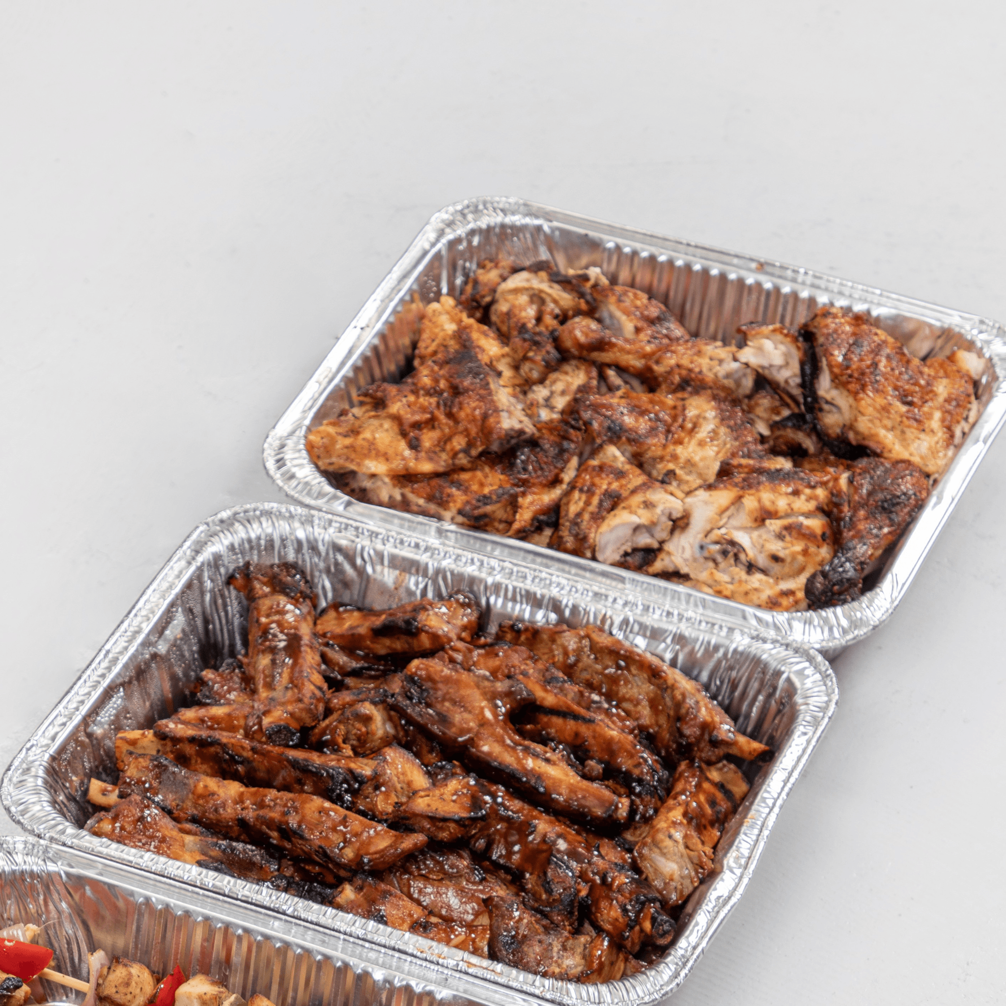 4 pieces chicken, 3 pieces of BBQ ribs, served with large side of rice and one large side of french fries.